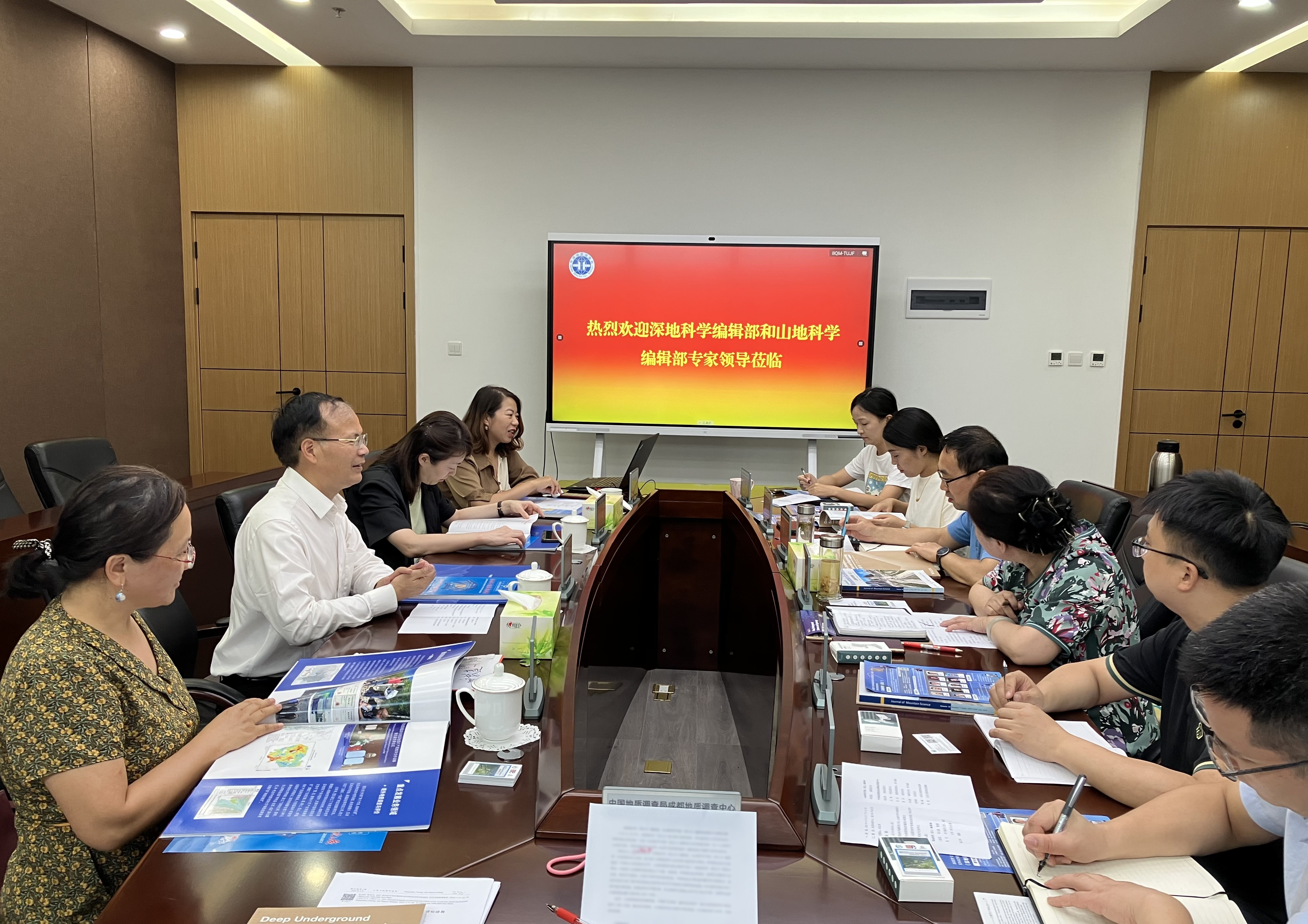 《DUSE》编辑部和《JMS》编辑部一行介绍了两个期刊的基本情况,以及国际化办刊和科学家办刊的模式,并希望通过此次座谈,扩大期刊学术影响力,促进学术成果的传播和推广。我中心对到访专家表示欢迎,并简要介绍了《沉积与特提斯地质》的学科特色、发展历程和办刊理念,同时还介绍了中心深地科学领域的发展情况、国家重点研发计划“深地专项”的执行情况以及中心山地科学学科的建设情况。双方就学术期刊建设,以及深地科学和山地科学方面高水平论文撰写、重大科技项目申报、基地平台共建等方面进行了深入交流。