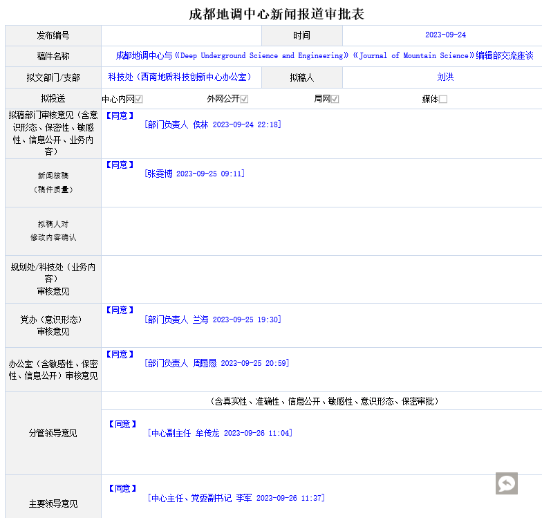 9月21日下午,中国矿业大学《Deep Underground Science and Engineering》(DUSE)副主编王建国教授、中科院山地所《Journal of Mountain Science》(JMS)编辑部主任邱敦莲研究员一行来成都地调中心座谈交流。成都地调中心科技处、信息化室、地质安全室、《沉积与特提斯地质》青编委和编辑代表参与了座谈。