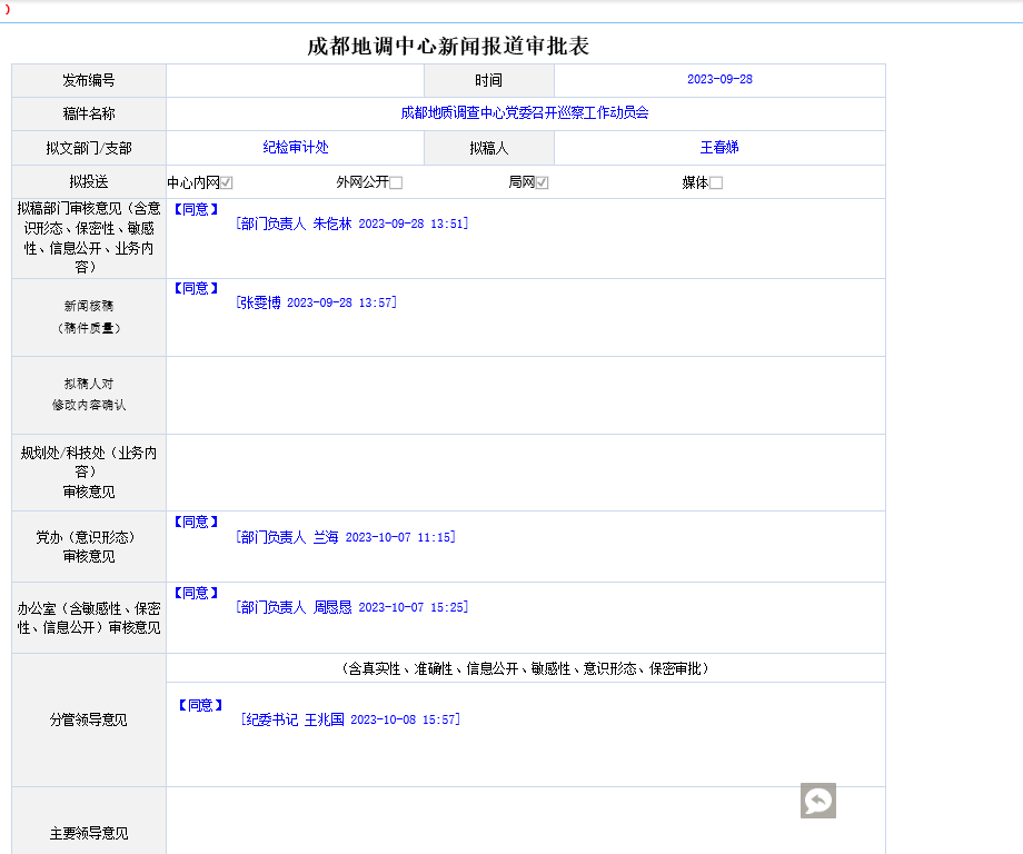 9月26日,中国地质调查局成都地质调查中心(西南地质科技创新中心)(以下简称“成都地调中心”)党委召开中心2023年巡察工作动员会。中心党委书记、副主任胡时友出席会议并作动员讲话。