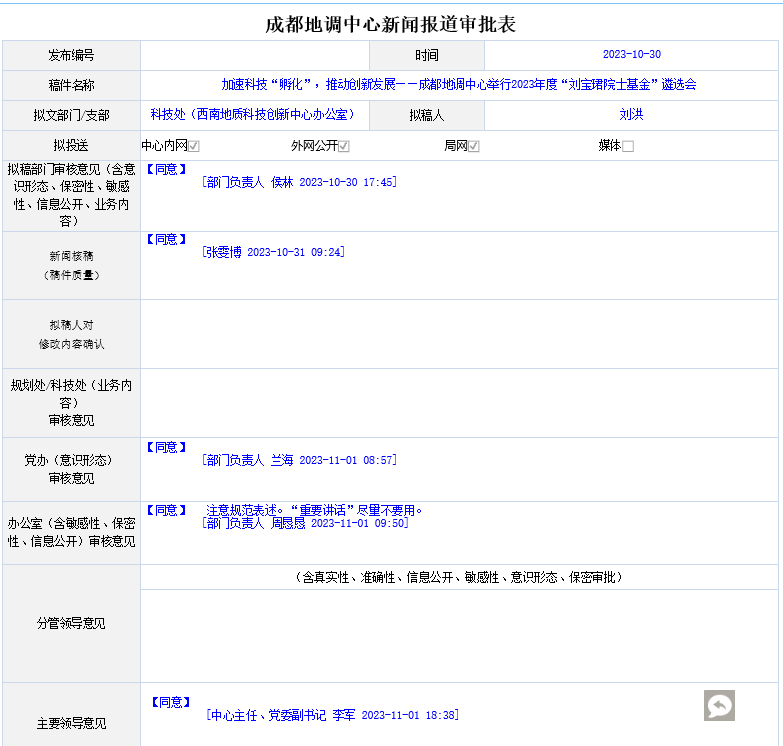 10月24日,成都地调中心成功举行了2023年度“刘宝珺院士基金”遴选会。成都地调中心副主任、党委委员牟传龙主持会议,中心主任、党委副书记李军参加会议。