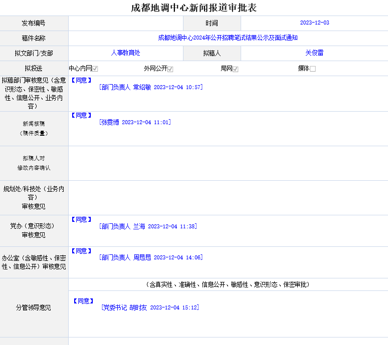 中国地质调查局成都地质调查中心(西南地质科技创新中心)2024年度公开招聘部分岗位笔试业已结束,现将笔试结果公示,并就下一阶段面试工作通知如下。