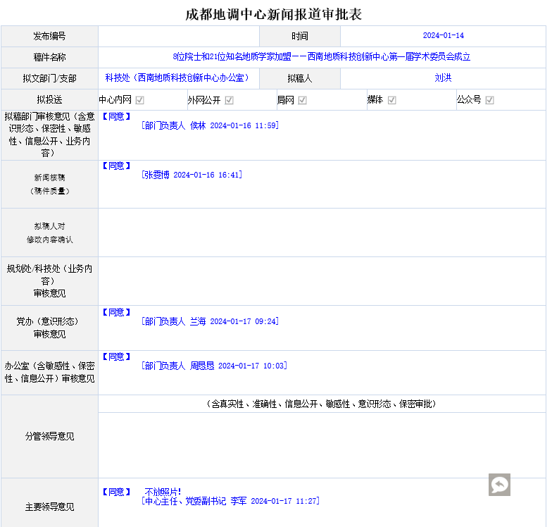 2024年1月12日,西南地质科技创新中心2023年学术年会隆重举行。年会宣布正式成立西南地质科技创新中心第一届学术委员会,并向委员们颁发了聘书。