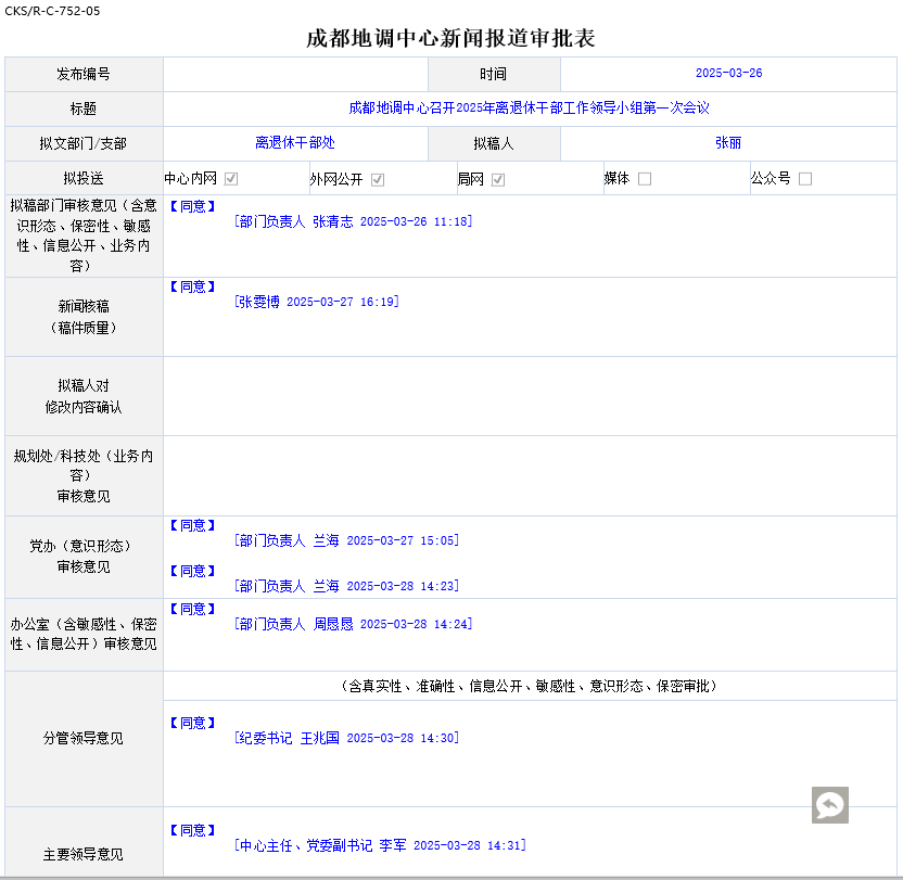 3月20日,中国地质调查局成都地质调查中心召开2025年离退休干部工作领导小组第一次会议。中心主要负责同志出席会议并讲话。中心分管离退休干部工作同志主持会议。