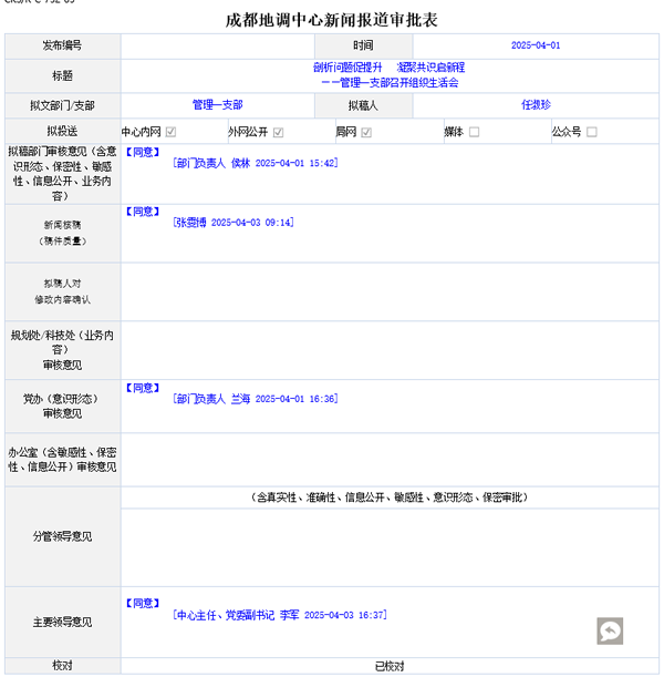 2025年3月26日,管理一党支部召开组织生活会。中心主要负责同志出席会议并作总结,纪审处工作人员列席会议。会议由党支部书记侯林同志主持。