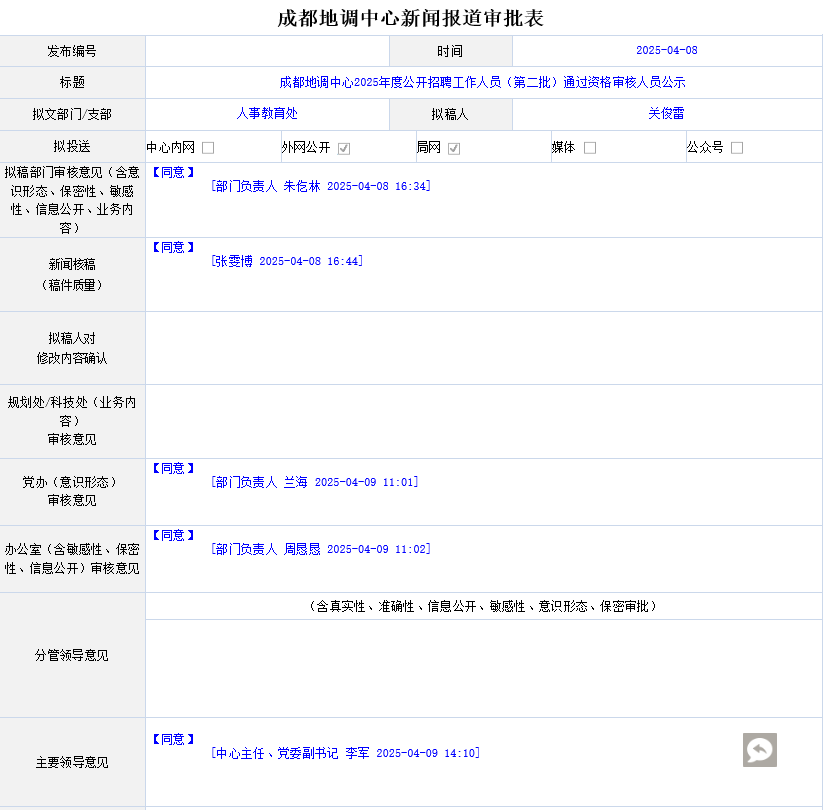 根据《中国地质调查局成都地质调查中心(西南地质科技创新中心)2025年度公开招聘工作人员公告(第二批)》,经个人报名、资格审核,现将通过人员名单公示如下: