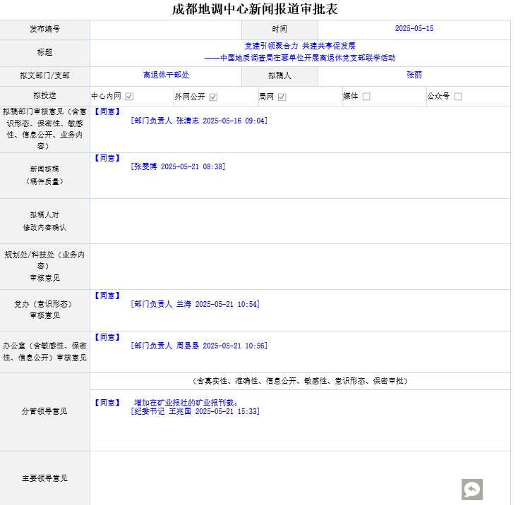 成都地调中心将以此次党建联建活动为契机,主动担当,总结经验、创新思路,持续推动局属在蓉单位之间协作联动。下一步将联合军民融合中心在其唐昌基地开展离退休党员实地调研活动,进一步促进资源共享、优势互补、合作共赢,以实干实效助力地质调查事业高质量发展。