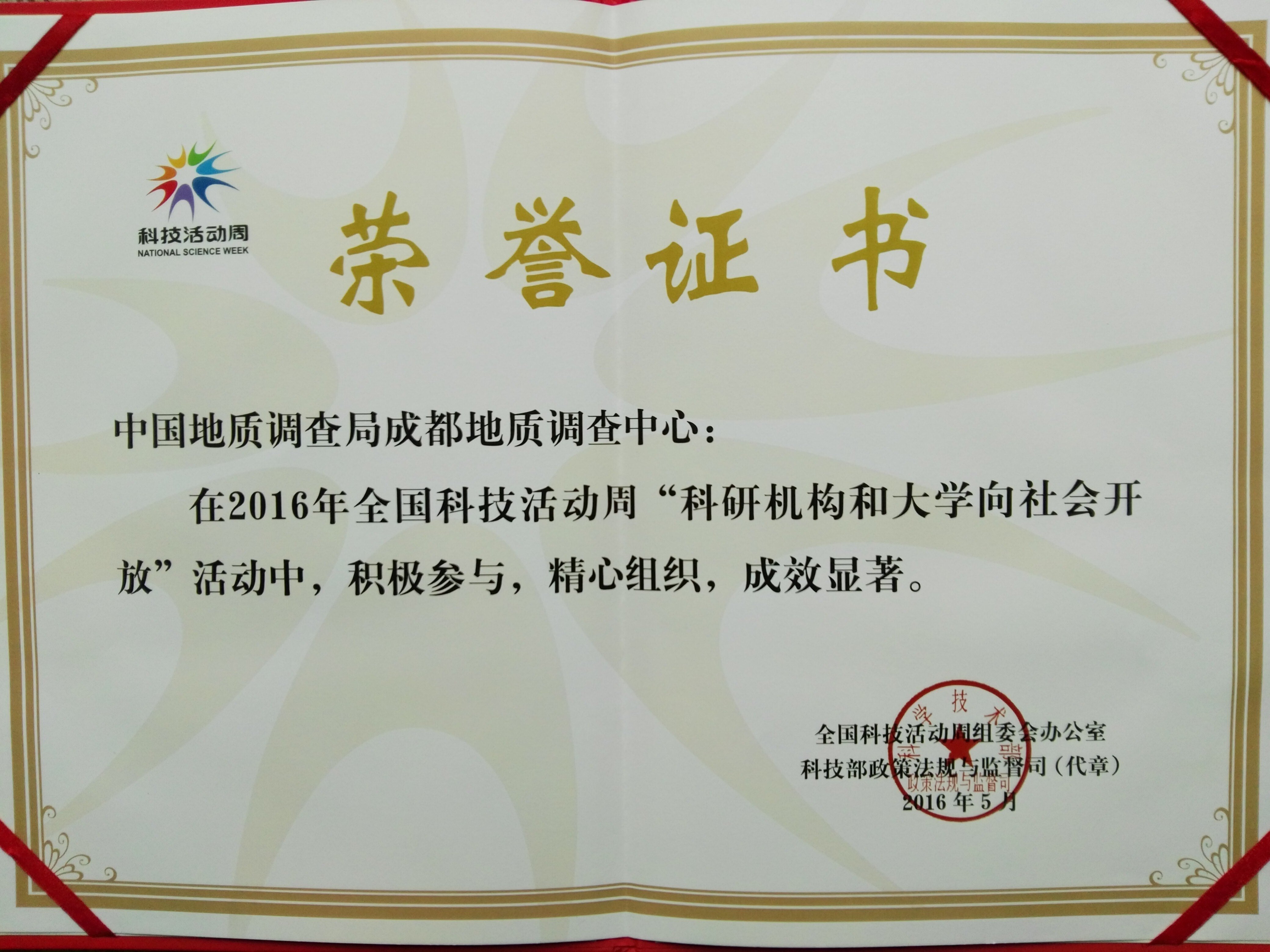 年全国科技活动周‘科研机构和大学向社会开放’活动中,积极参与,精心组织,成效显著”,获得了全国科技活动周组委会颁发的荣誉证书。