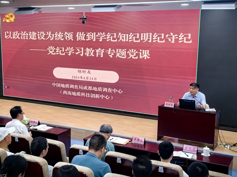 6月14日上午,成都地调中心党委书记、副主任胡时友以“以政治建设为统领 做到学纪知纪明纪守纪”为题,为中心全体党员干部讲授党纪学习教育专题党课,中心主任、党委副书记李军主持会议并作总结讲话。