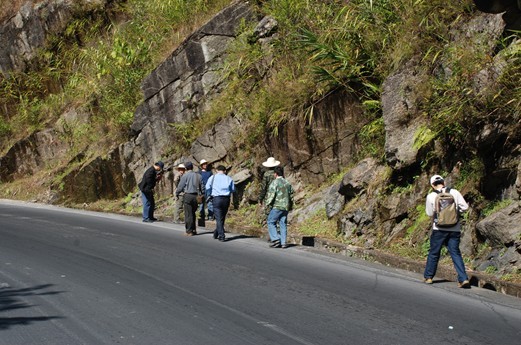 14日上午,一行人在王洁民副所长的带领下,首先兴致勃勃地考察了三台山超基性岩和白垩系,对超基性岩的组成与接触关系进行了培训。随后,在林仕良等项目组人员的讲解下对位于芒市附近一条花岗岩地质构造剖面进行了实地考察,探讨。