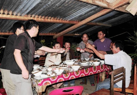 2010年12月31日,丁俊主任等与帕莱通项目组同事们一起在住地自做饭菜,共度元旦佳节,给项目组发放了慰问品,并邀请了当地居民代表共进晚餐。在“晚宴”上丁俊主任通过翻译表达了他对老挝朋友的新年祝福,他说:“中国人民和老挝人民是很好的朋友,我们的工作人员在你们这里工作,得到了你们大力的支持和帮助,很感谢你们,待这边的工作顺利完成后,我邀请你们去中国参观、做客。祝你们新年快乐!”