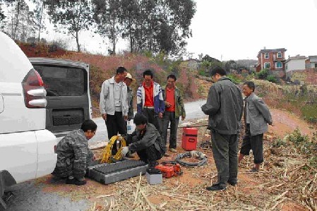 工作组昼夜兼程,于4月1日抵达云南昆明,当日领取了中国地质调查局和当地管理部门组成的抗旱指挥部下达的任务,次日即到达抗旱救灾现场开展工作。工作组的主要任务是在红河哈尼族彝族自治州干旱山区通过物探方法,为打井钻探提供精确定位和深部信息。4月3日开始,工作组先后在建水县、蒙自县、个旧市、开远市等地共十个乡、镇,十一个自然村开展物探找水工作。在当地国土资源局和乡政府、村委会的协调配合下,截止4月23日,共完成物探测深点158个,推断解释剖面22条,查明了工作区断裂位置、暗河形态、岩溶发育等地质情况,完成深井定位8孔,判断排除无水深井位1孔。选定的8孔深井位已开钻2孔,均已达到自流水。其中个旧市大屯镇罗衣寨物探建议井位施钻,在孔深180米处打出了地下水,出水量300立方米/天,缓解了该村长年干旱的问题。昨日,建水县青龙镇沙山村又传来喜讯,由成都地调中心和水环所物探工作组联合布置的钻井工程,在地下160米处打到了地下水,抽水试验出水量100立方米/天。