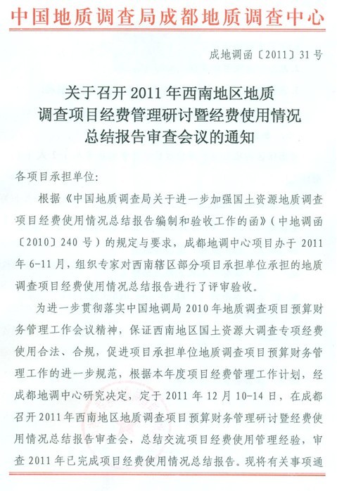 关于召开2011年西南地区地质调查项目经费管理研讨暨经费使用情况总结报告审查会议的通知