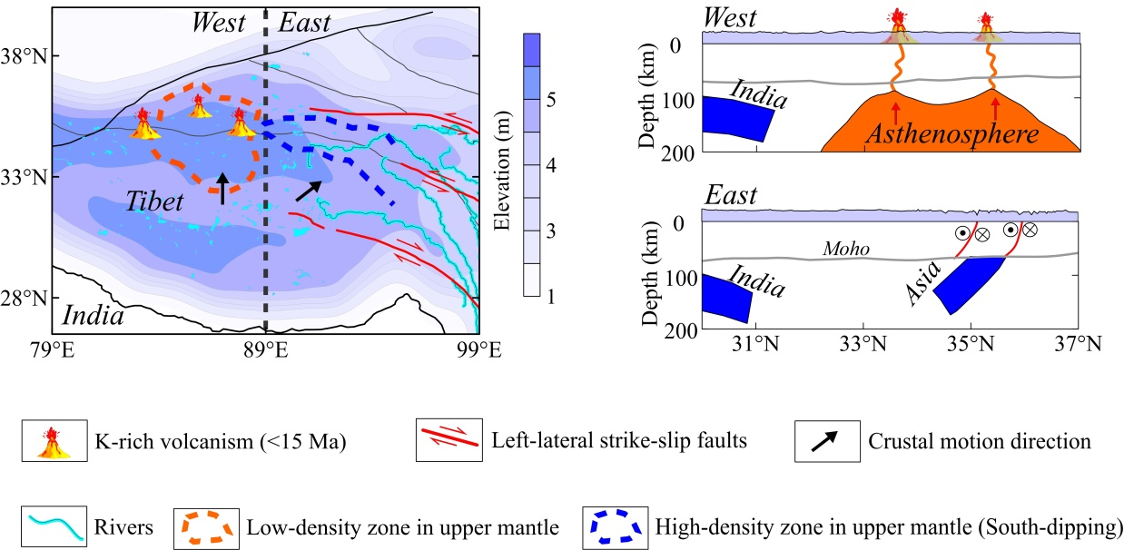 青藏高原作为地球上最年轻、海拔最高的高原,其形成与印度板块和亚欧板块的碰撞密切相关。值得注意的是,高原地形、地壳变形、构造运动以及中新世以来的岩浆活动在东西方向上均呈现出明显的东西不对称性(图1)。这些现象是否与岩石圈深部变形有关?岩石圈深部变形如何影响地表地质活动?这些问题对于理解高原演化和板块构造动力学具有重要意义。
