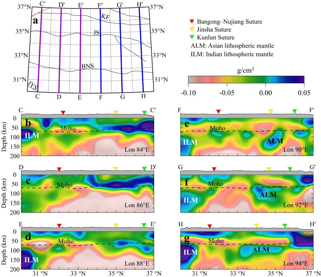 研究团队基于研发的互相关系数自约束三维重力反演方法,并结合地震速度先验约束,构建了青藏高原北部(北纬30°~37°,东经83°~95°)岩石圈密度异常模型,发现在金沙江缝合带附近之下,岩石圈地幔密度结构存在显著的东西差异(图2):西部(东经83°~89°)呈现出明显的低密度异常特征(低于-0.1g/cm3),这可能与岩石圈去根伴随的软流圈上涌有关;而在东部(东经89°~95°)莫霍面至约160 km深度处,存在向南倾斜的高密度异常(约为0.05 g/cm3),这可能反映了向南俯冲的亚洲岩石圈地幔。